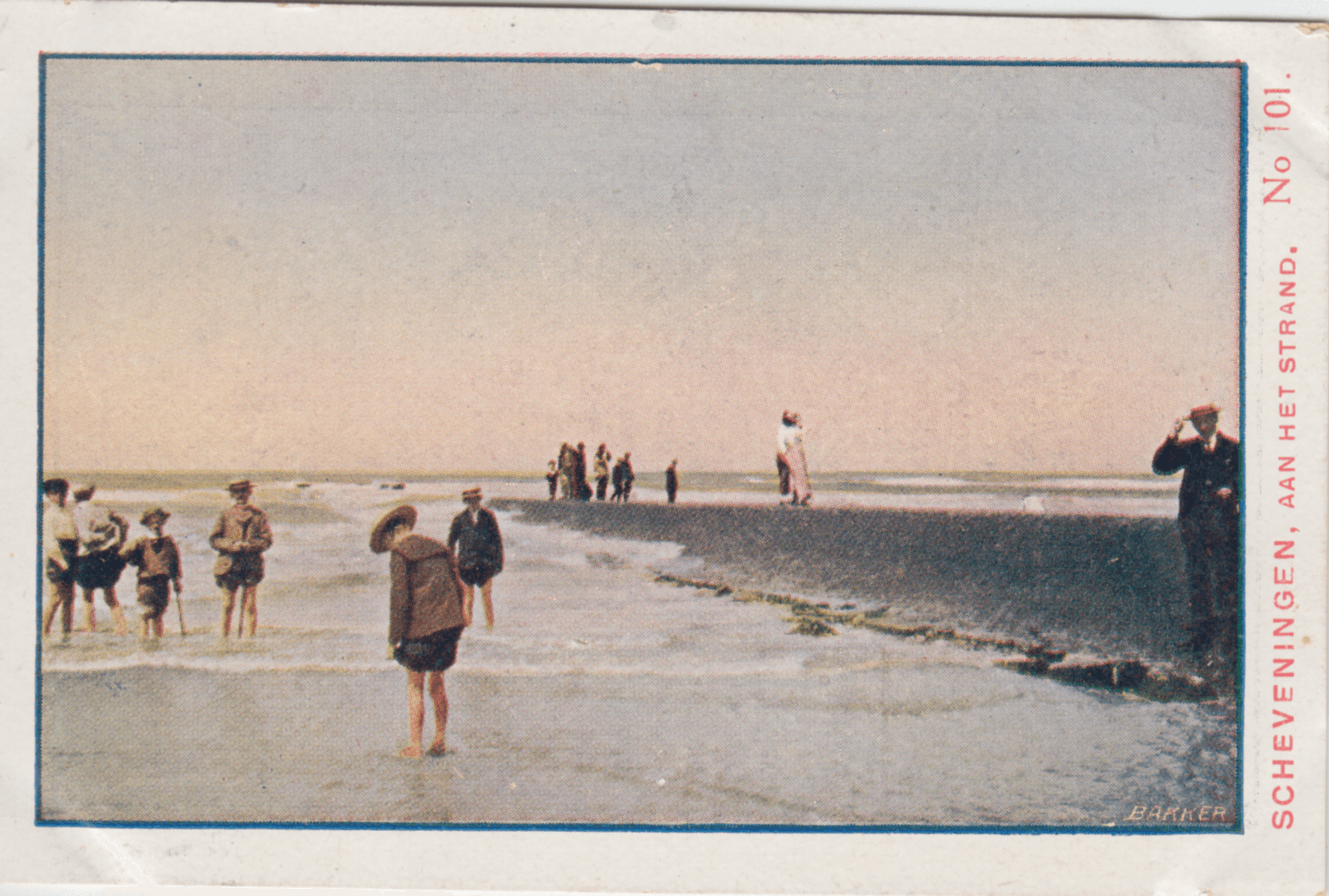Dit kalme strandtafereel is op 'n rustig moment te Scheveningen genomen, want wie 't bedrijvige gedoe in deze mondaine badplaats kent, zou door dit kijkje daar niet aan herinnerd worden.