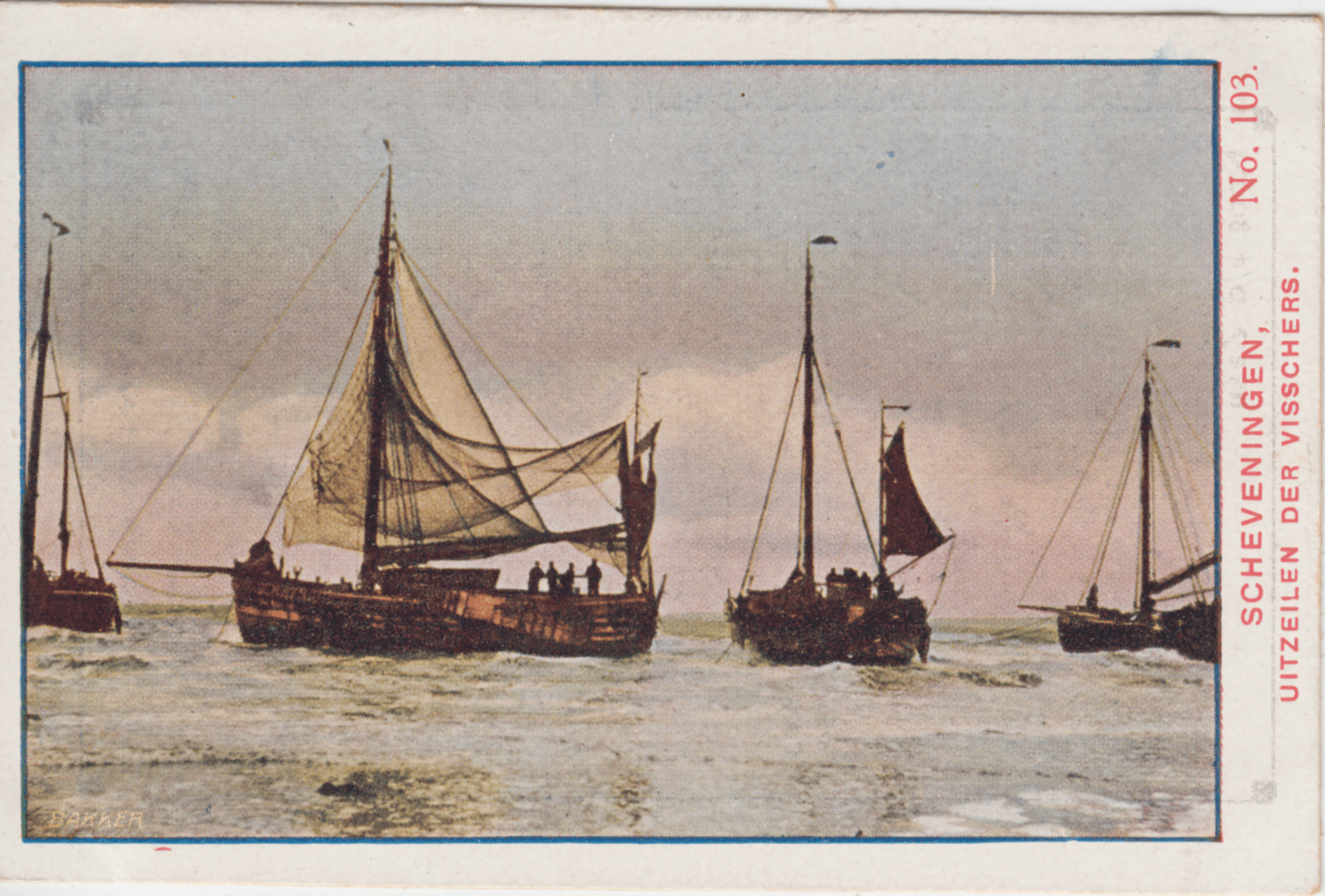 Dit plaatje geeft ons een kijkje op het uitzeilen der Scheveningsche visschers. Welk eene tegenstelling, het ruwe leven dier nijvere menschen, die in weer en onweer op 't eeuwig wisselende element vertoeven, blootgesteld aan allerlei gevaren, en 't vroolijke, wufte leven dergenen, die ontspanning en afwisseling aan het strand komen zoeken.