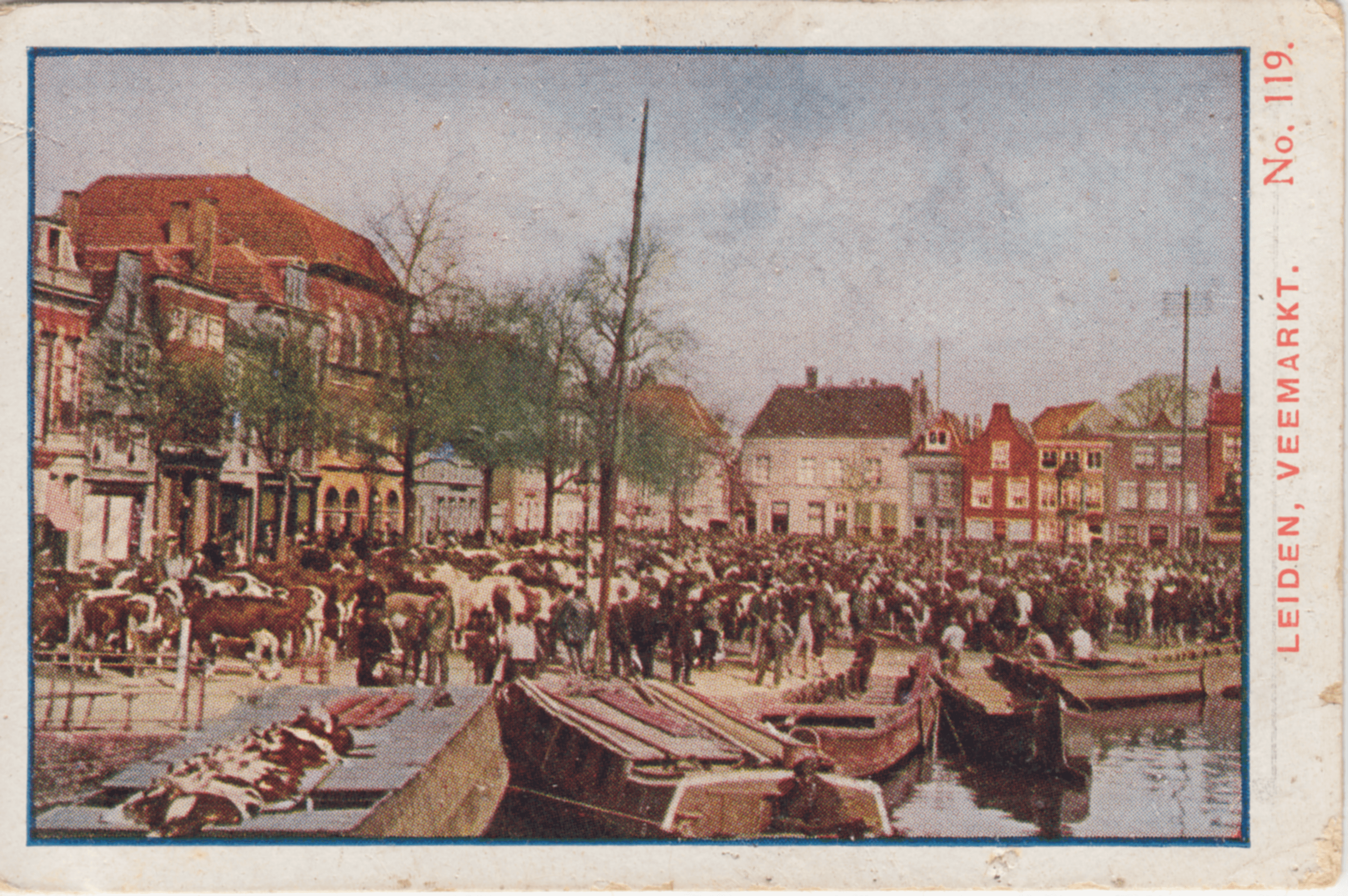 Welk een bedrijvig tooneel geeft ons dit plaatje te aanschouwen! We hebben hier een kijkje op de Veemarkt te Leiden, de bekende Academiestad in de provincie Zuid-Holland. Leiden is rijk aan historische herinneringen en daarbij is 't eene stad, die nog vele grachten met schoone huizen bezit, en verschillende fraaie straten en stadsgedeelten. Om de 5 jaren trekt deze plaats een groot aantal vreemdelingen, die komen kijken naar de historische, gecostumeerde optochten, welke bij gelegenheid der studentenfeesten aldaar gehouden worden.