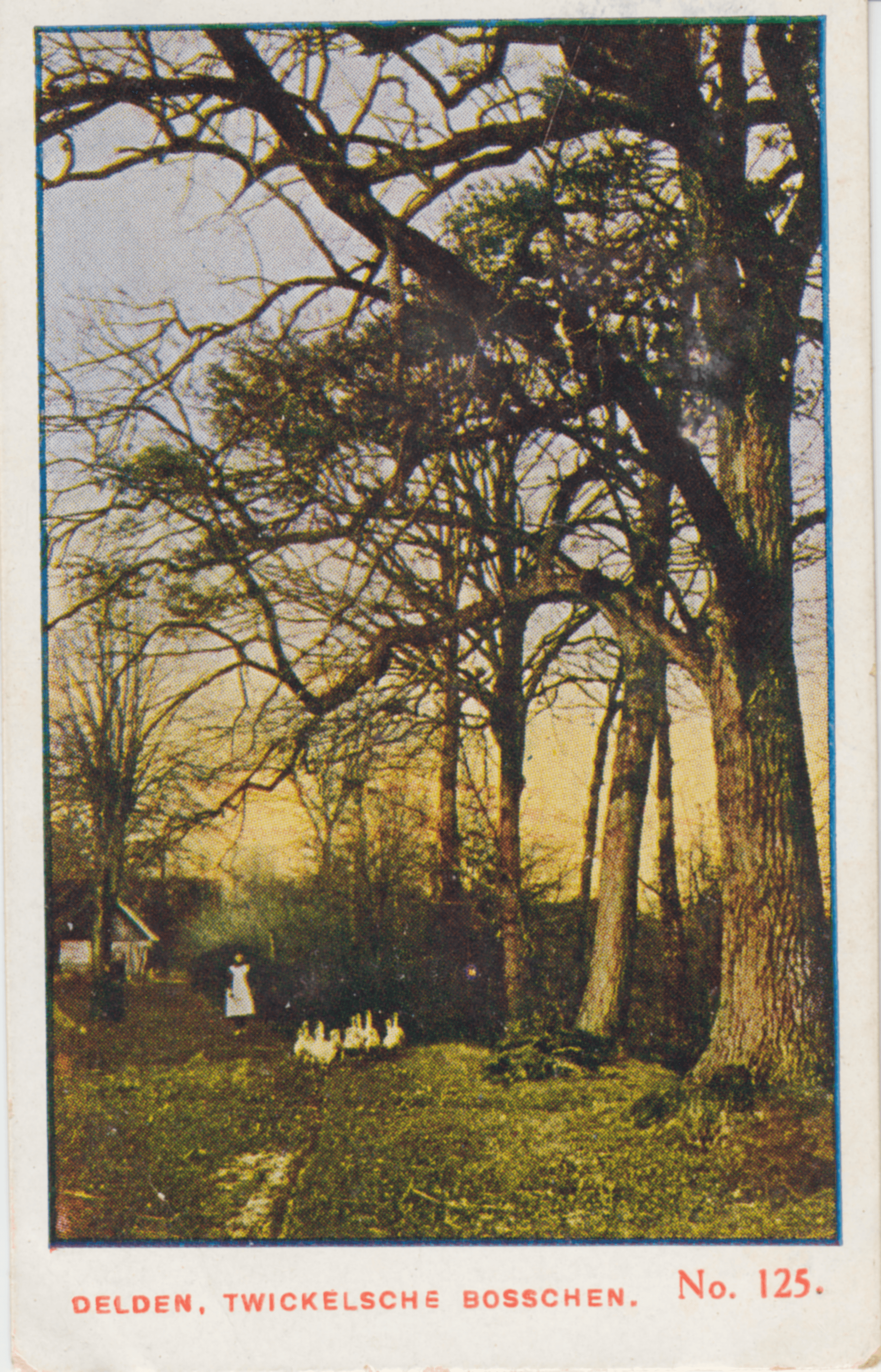 Gaven we elders een kijkje op den watermolen bij Delden, dit gezichtje verplaatst ons in de Twikkelsche Bosschen, behoorende bij het uitgestrekte landgoed Twikkel in de Overijselsche gemeente Ambt Delden. Oudtijds was het Huis Twikkeloo een versterkt Kasteel, dat tijdens den Spaanschen Oorlog menigmaal belegerd werd.