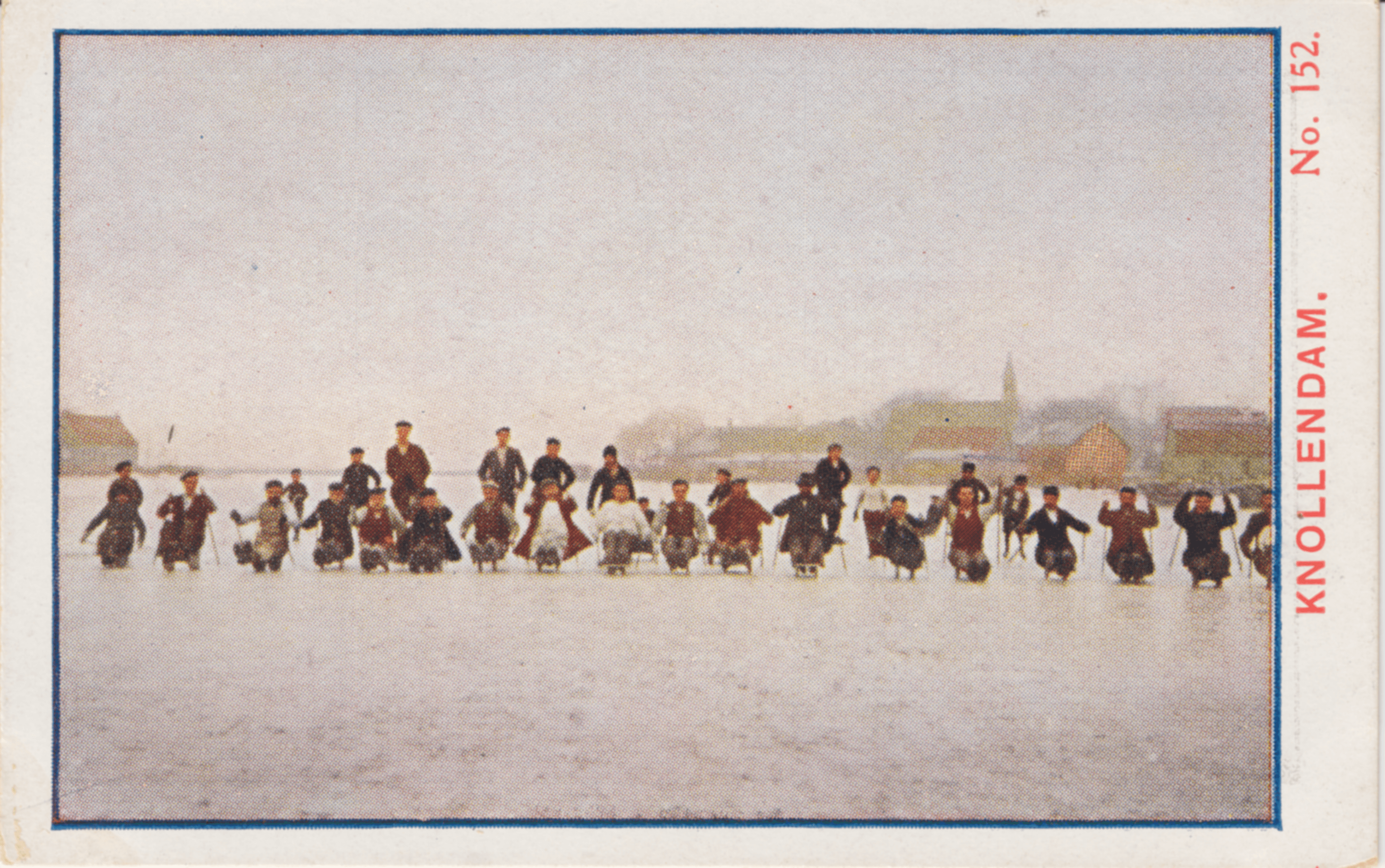 Nog een plaatje van het op de beide Zaanoevers gebouwde Knollendam; ditmaal biedt het een aardig schouwspel. Een aantal Knollendammers op priksleden is gereed af te steken voor een wedstrijd.