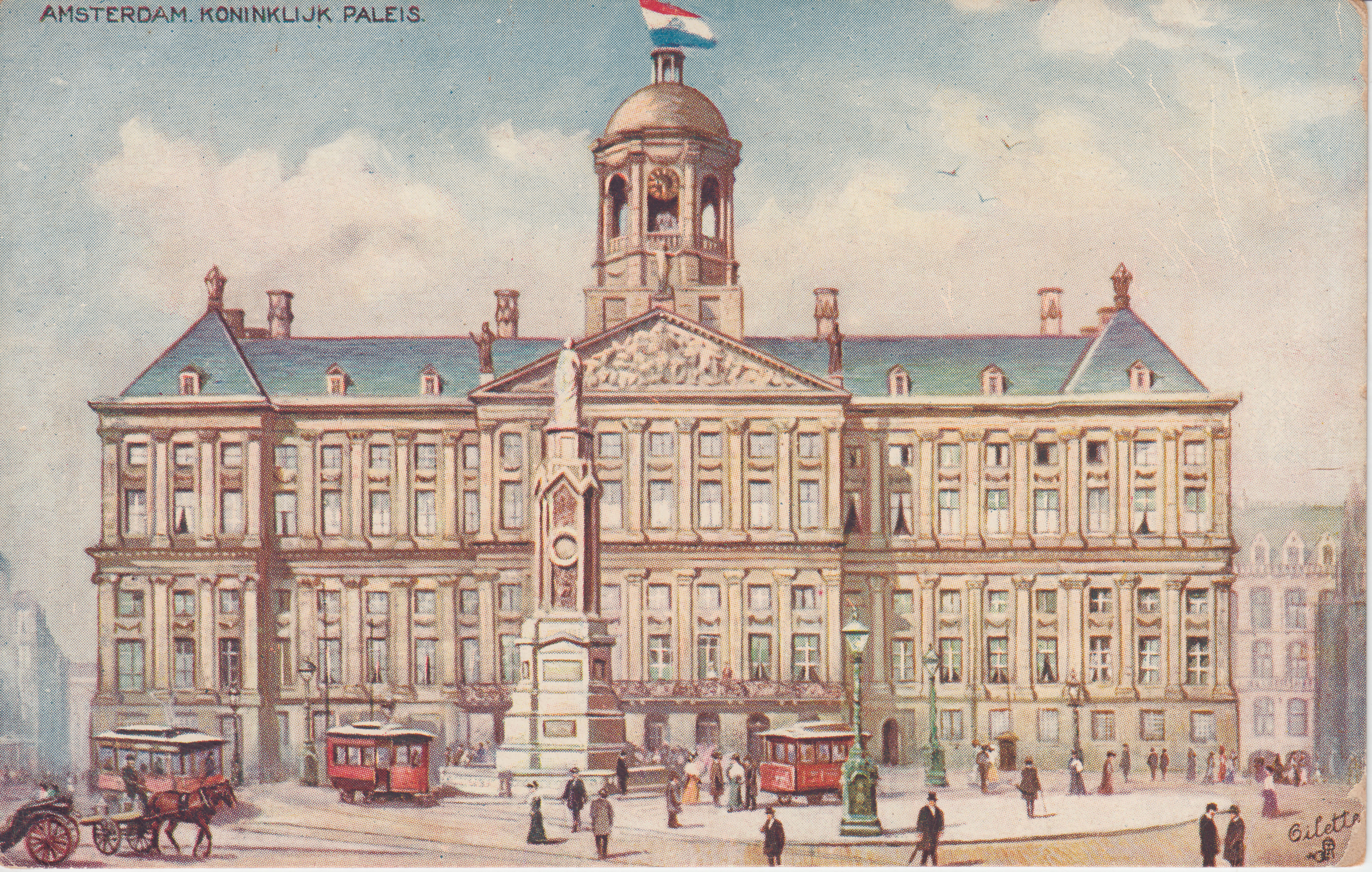 The Royal Palace was begun by Jacob van Kampen in 1648 as a town hall, and completed in 1655 at a cost of 8,000,000 florins, being presented by the city to King Louis Bonaparte as a residence in 1808. Its length is 264 feet, and the height of the tower (which contains a chime of bells) 187 feet. It rests, like all of Amsterdam's buildings, on an artificial foundation of piles, no less than 13,659 being used for the purpose.