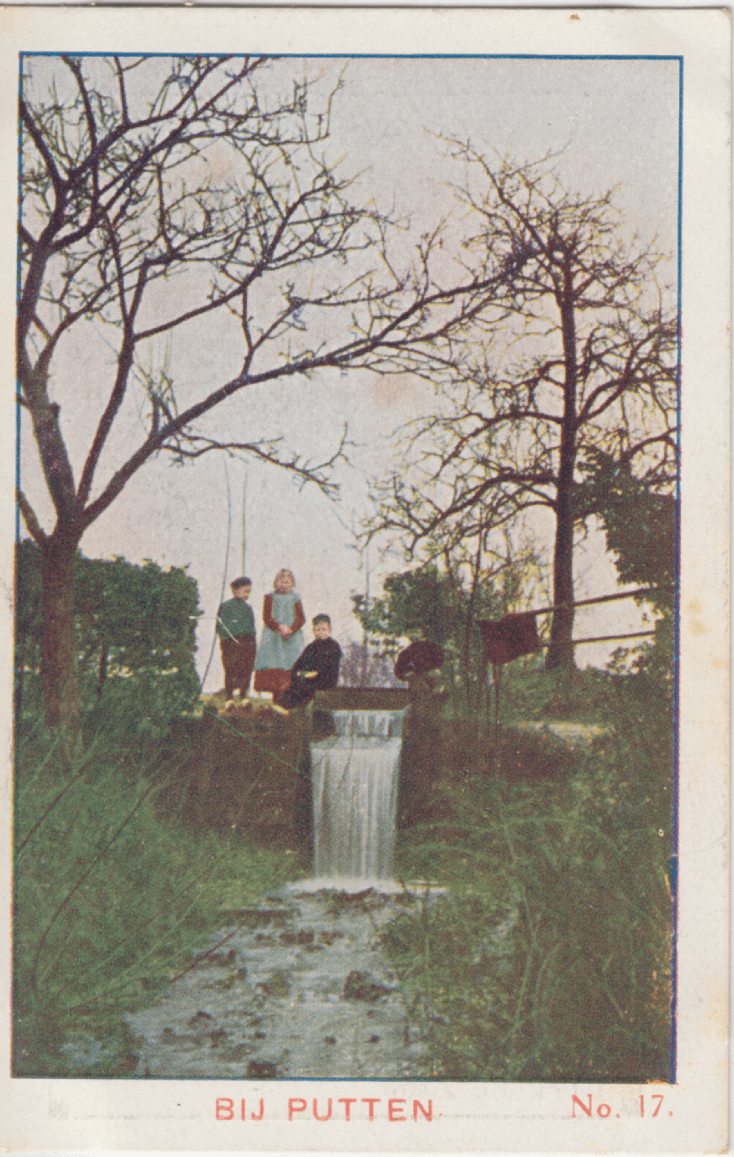Weer een kiekje van Putten. Gaf 't andere ons uit dezelfde plaats een keurig boschgezicht, hier zien we een aardig watervalletje, waaraan een drietal jeugdige dorpsbewoners blijkbaar hun volle aandacht schenken.
