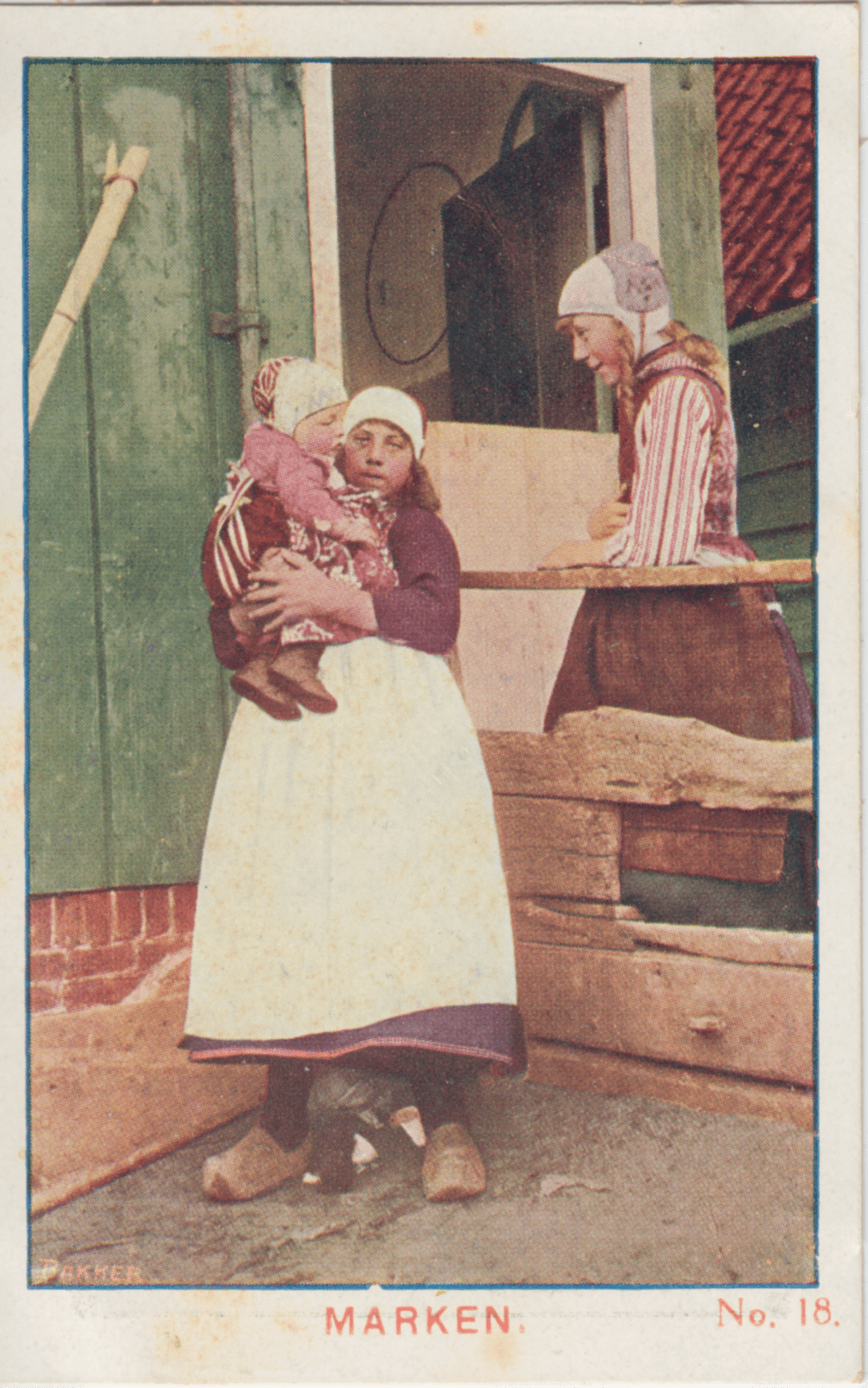 We behoeven niet eens het toelichtende onderschrift van dit plaatje te lezen om te weten, dat we een kiekje voor ons hebben van het eiland Marken, welke bewoners, trots de mode die rondom haar schepter zwaait, trouw zijn gebleven aan de eigenaardige zeden en kleederdracht hunner voorvaderen. De bijzondere inrichting hunner woningen, hun vreemde kleedij zijn oorzaak, dat jaarlijks talrijke vreemdelingen het kleine eiland bezoeken.