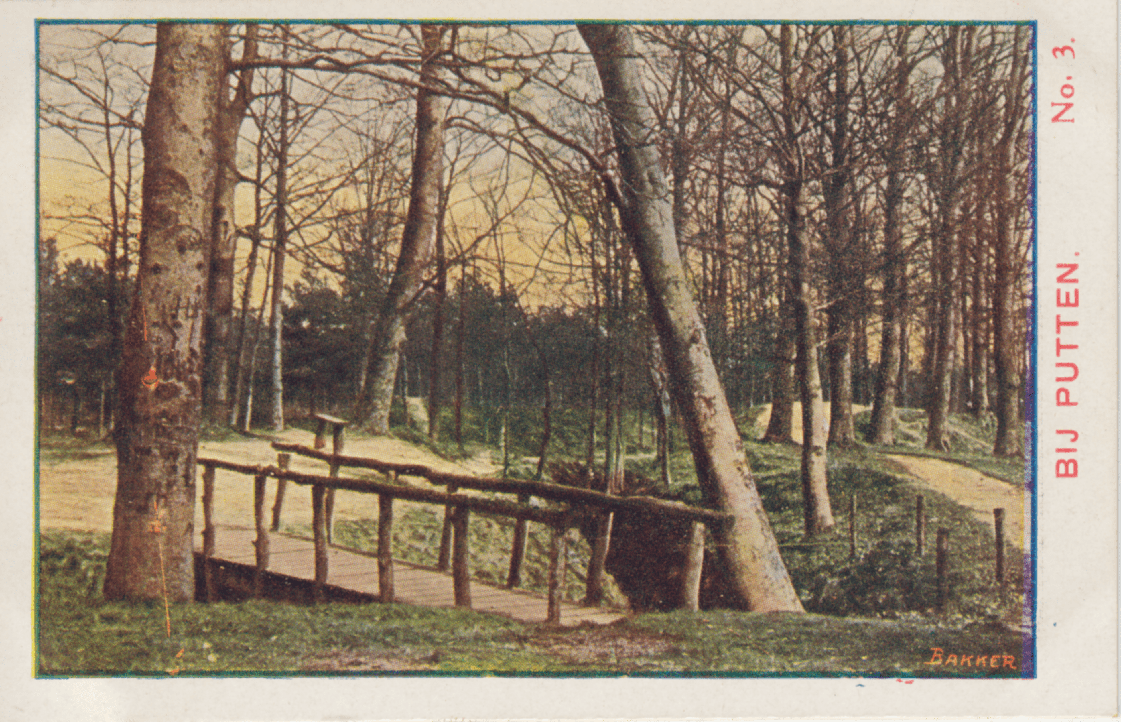 Putten is een dorp in Gelderland. Het mooie kiekje, dat we hier te zien krijgen toons ons aan, dat we er volop kunnen genieten van het bosch. Nu is 't nog niet in feesttooi, maar als 't straks lente is en de boomen hun lichtgroen bladerenkleed hebben aangetrokken, zal 't er wel heerlijk wandelen en rusten zijn.