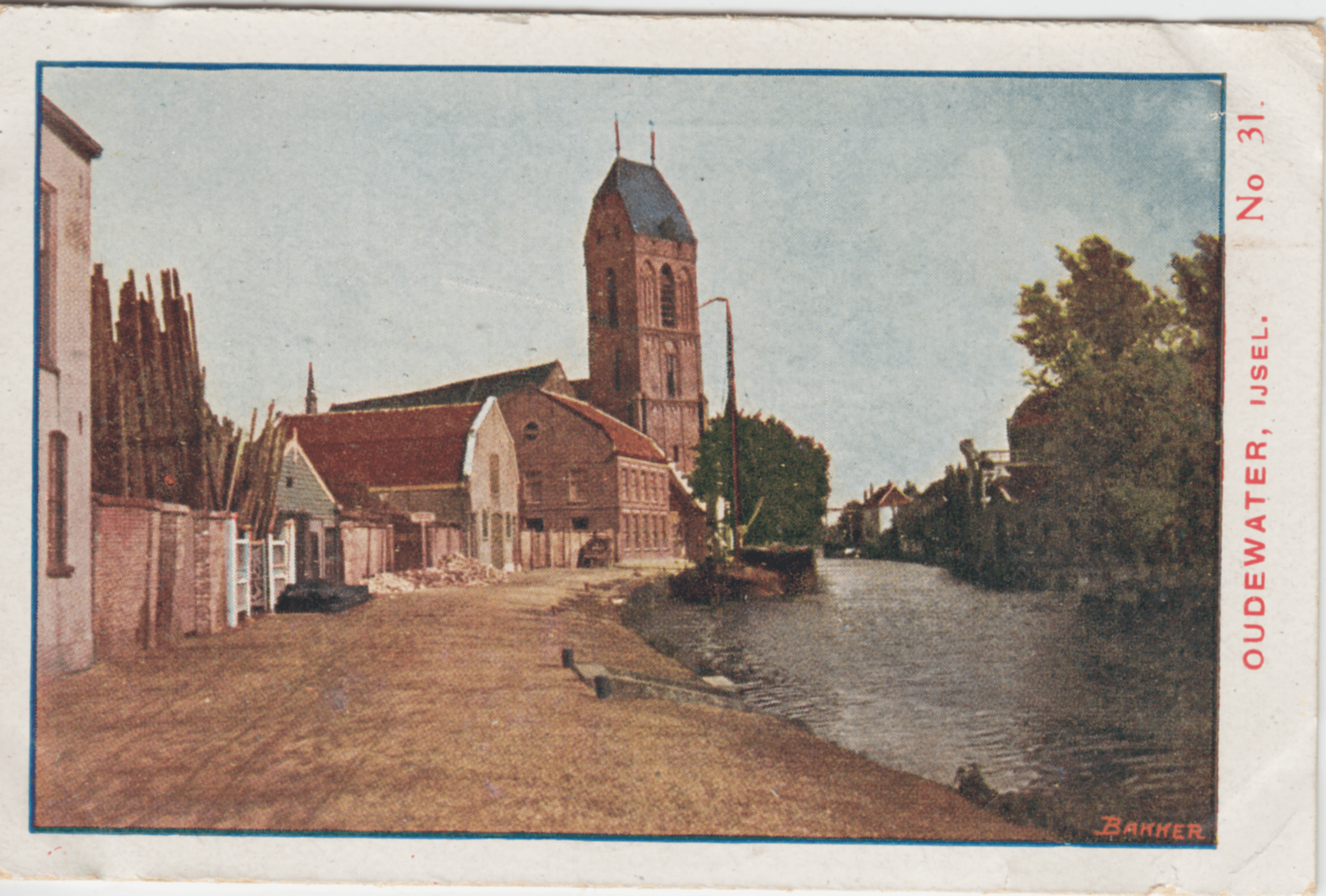 Oudewater is op beide zijden van den IJsel gebouwd, is een oude plaats. Ons plaatje biedt ons een gezicht op een gedeelte van den IJsel en op de oude kerk met haar eigenaardigen toren in Frieschen bouwtrant. De bevolking van Oudewater houdt zich hoofdzakelijk bezig met handel in kaas en andere plattelandsproducten, fabrieksarbeid en winkelnering.