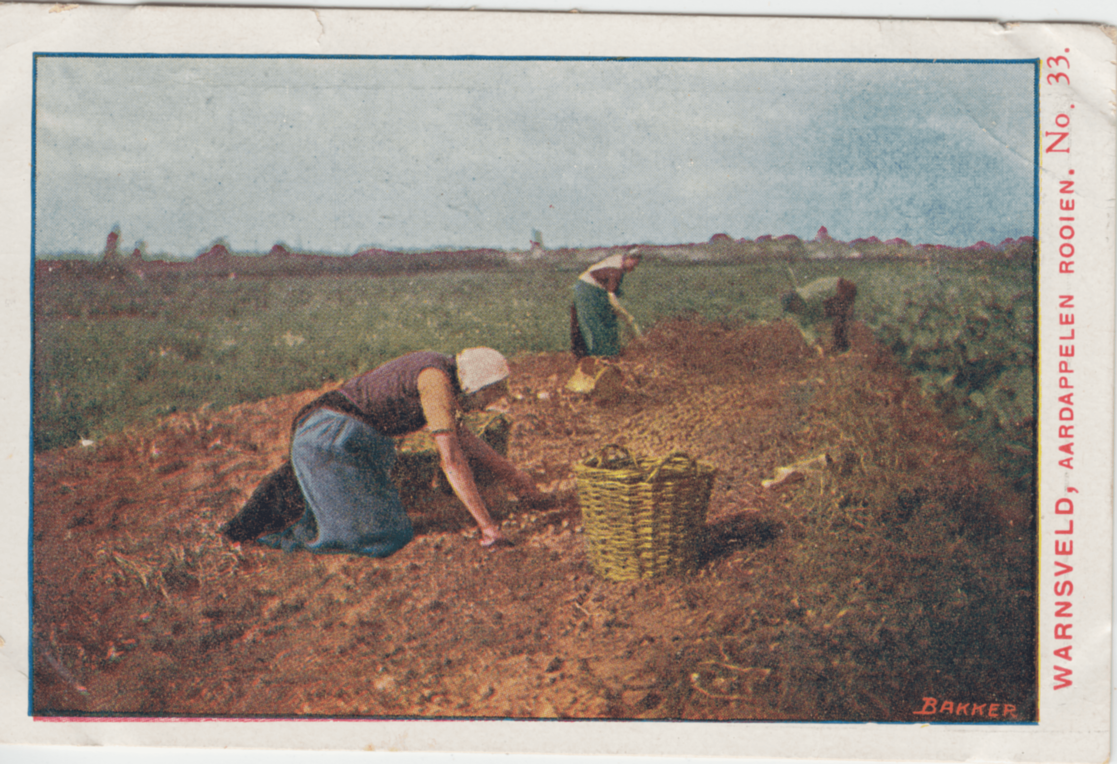 'n Kiekje van Warnsveld. Ter afwisseling nu een voorstelling van dorpsbewoners, die bezig zijn aardappelen te rooien. Een fleurig, mooi tooneeltje.