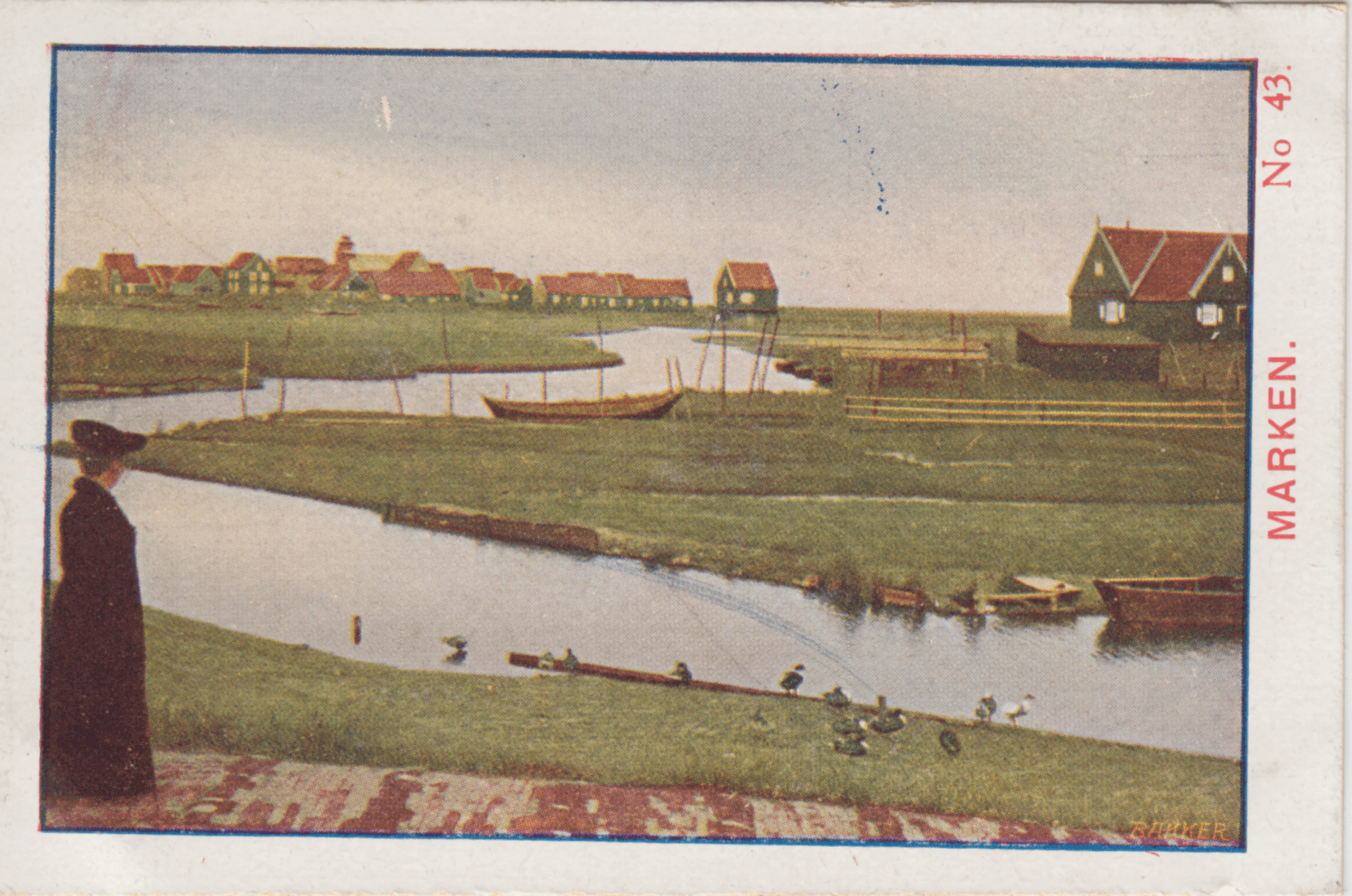 Weer 't eiland Marken, maar nu een kiekje op 't eiland zelf en niet zooals de andere van binnenhuis of bewoners. Marken wordt door vele vreemdelingen, vooral Engelschen en Amerikanen, bezocht. Ze gaan dan met de daarvoor bestemde boot van Amsterdam, doen Broek in Waterland, Edam en Monnikendam aan, en halen hun hart op aan de talrijke oudheden en eigenaardigheden, die ze er te zien krijgen.