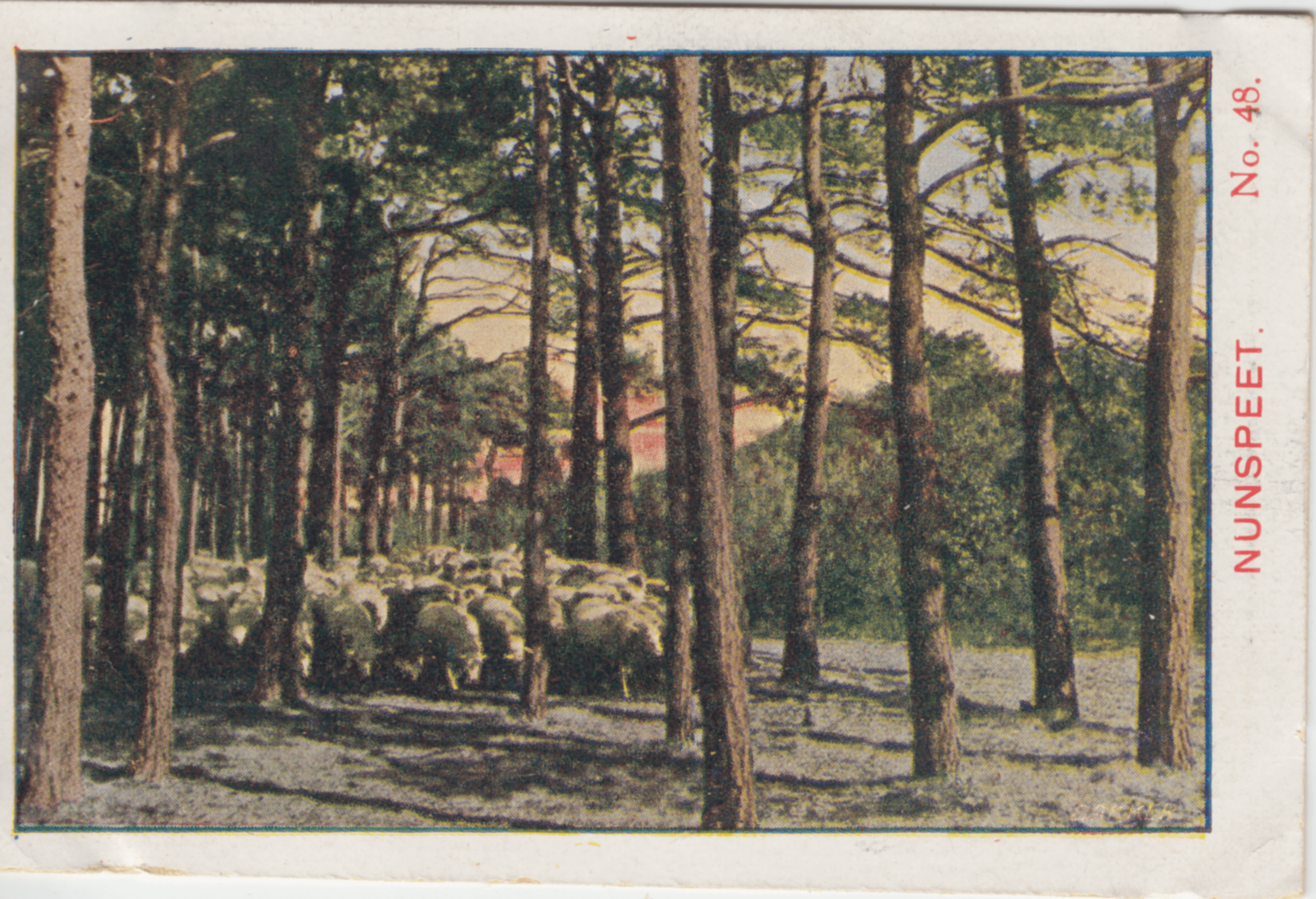 Een mooi tafereeltje voor Mauve's penseel, die kudde schapen te midden der hoogopgaande boomen. Nunspeet, de plaats waar dit kiekje werd genomen, is een welvarend dorp in Gelderland op de Veluwe. De lucht is er zeer gezond en vind men er dan ook inrichtingen voor herstel van longlijders.