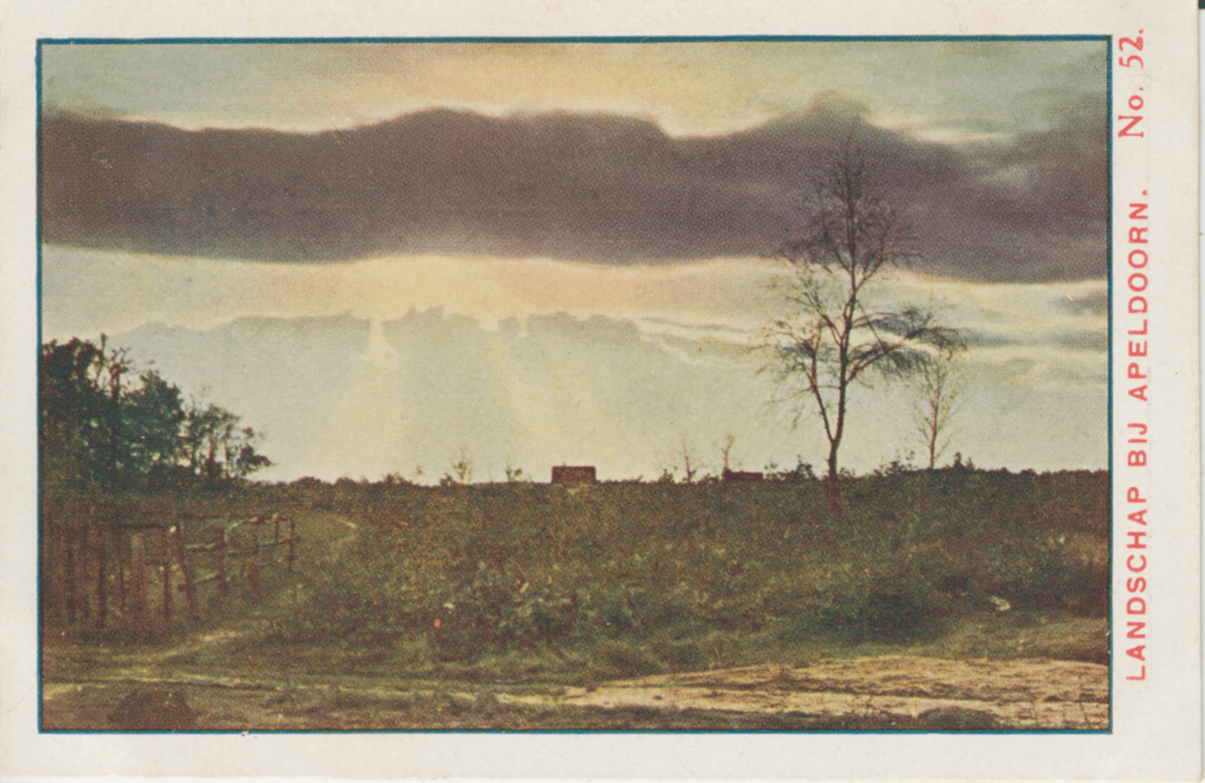 Dit plaatje biedt ons een kijkje op de Veluwe met uitgestrekte zandgronden. Mooi dal, eenzame boompjes, afstekend tegen den prachtigen wolkenhemel — 'n beeld van eenzaamheid op de groote, wijde vlakte.