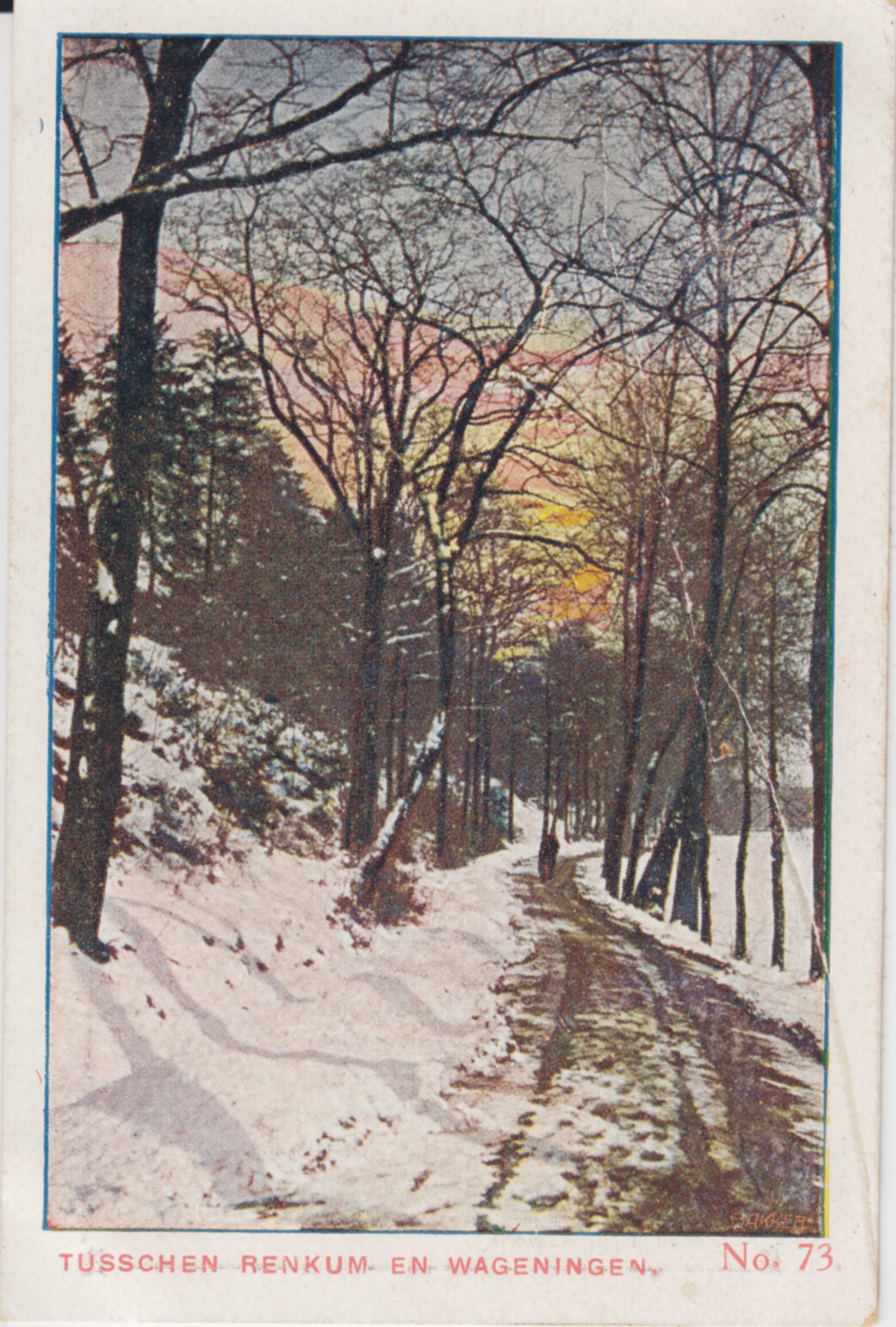 Dit is een overheerlijke wandelweg, waar men op ons plaatje nu rondom sneeuw ziet, doch waar men in den nazomer aan de eene zijde heuvels met prachtig sparregroen heeft en aan de andere zijde een lilavlakte van Erica ziet.