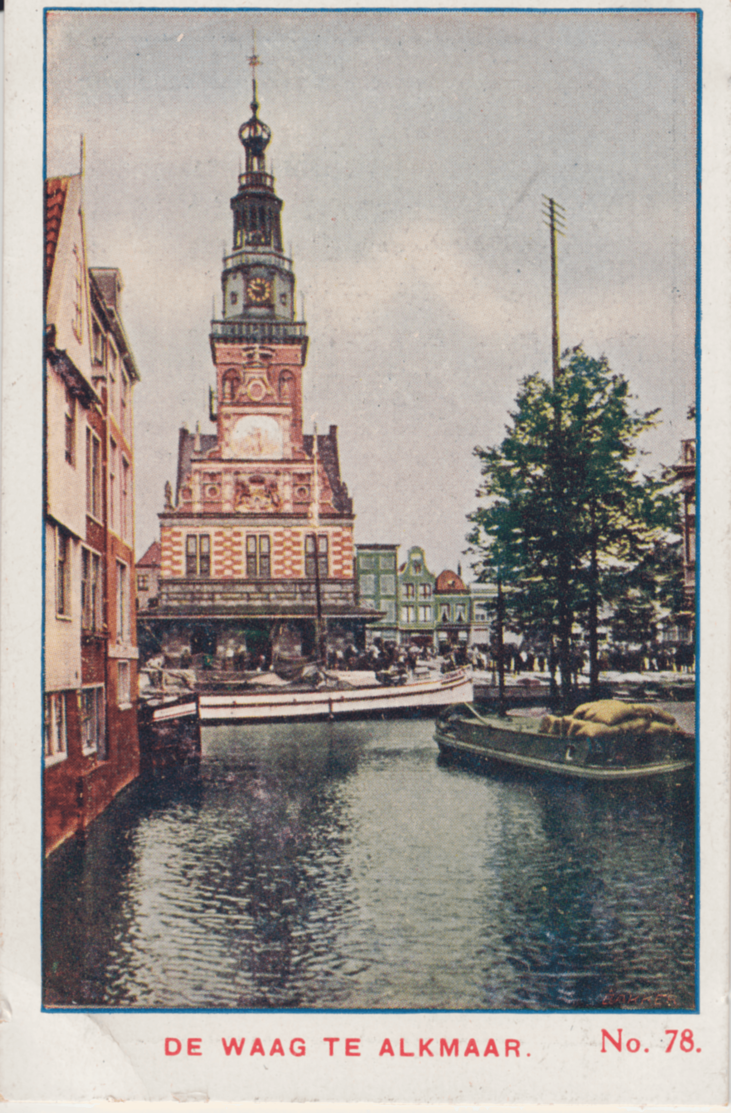 Dit plaatje geeft ons een gezicht op de Waag de Alkmaar, de oude hoofdplaats van Kennemerland. Alkmaar bloeit door handel en scheepvaart, maar vooral door haar markten, waar veel kaas, boter, runderen, schaapen, varkens enz. door een groot deel der Kennemersche en Westfriesche bevolking worden aangevoerd.